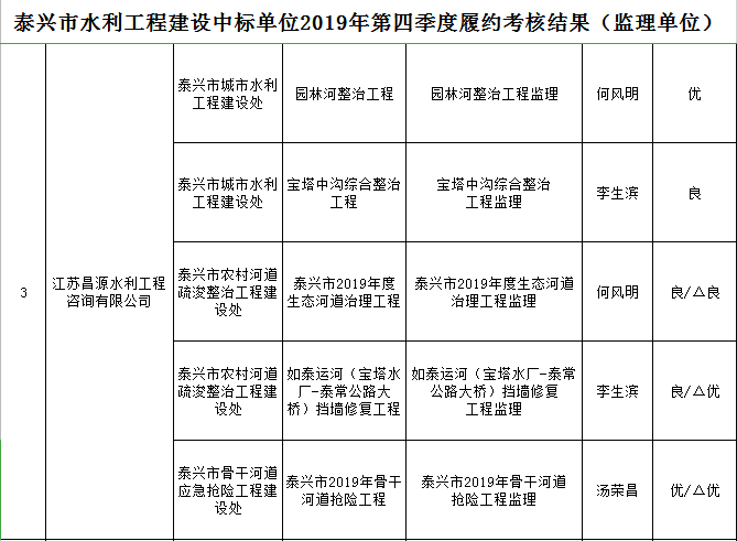 泰興市水利工程建設中標單位2019年第四季度履約考核結果